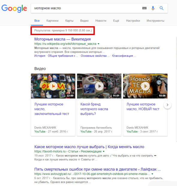 А вот другой запрос «моторное масло» уже имеет 9 150 000 страниц в конкуренции, и при таком запросе уже пробиться трудно.