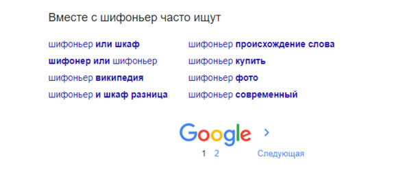 Google получил запрос «мебель для спальни». Google понимает, что человек хочет посмотреть какая мебель имеется для спальни. А это кровать, тумбочки, шифоньер, какие-то светильники, и многое другое.