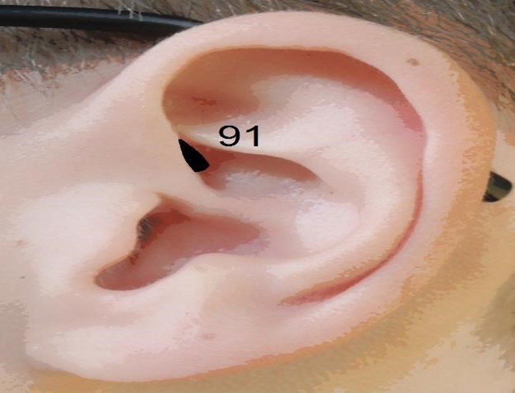 Аурикулярная биологически активная точка №91, толстая кишка, да-чан расположена на ушной раковине. Вплотную прилегает к ножке завитка в её восходящей части. В проекции – над слуховым проходом, только выше.