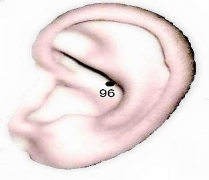 Точка № 96, поджелудочная железа – в левой ушной раковине, в правой – желчный пузырь, и-дань, в верхненаружном углу чаши раковины, над началом ножки завитка, но прижата вплотную к нижнему краю противозавитка.