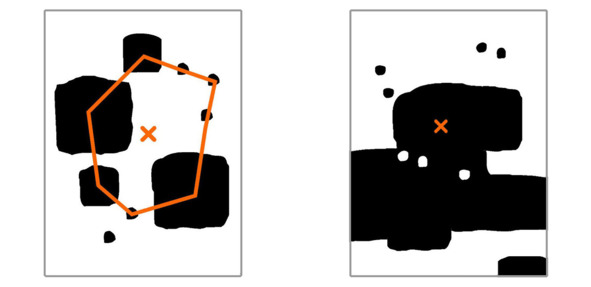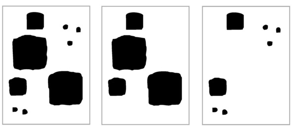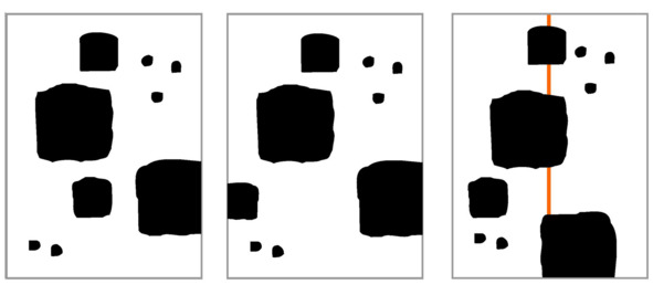 В примере справа композиционный центр находится в независимой части большого черного пятна. Эта часть отделена небольшими белыми пятнами. Здесь эти белые пятна не воспринимаются как акценты, все вместе они создают отсекающую линию. Здесь мы видим в действии принцип непрерывности из гештальтпсихологии.