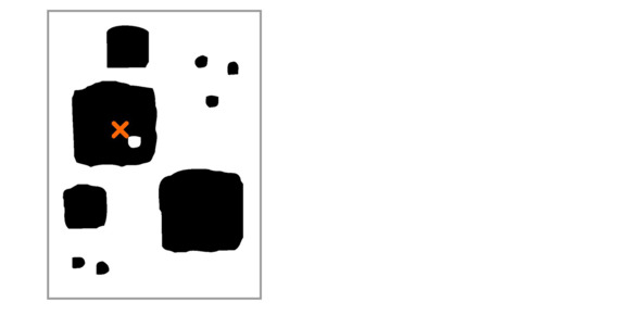 г). Сложные способы выделения композиционного центра. Часто композиционный центр выделяется не одним, а несколькими способами. В примере слева большое черное пятно с маленьким белым на нем работает с выделенной частью фона. В этом случае композиционный центр находится между тремя центрами: центром большого черного пятна, центром малого белого пятна и центром выделенной части фона.