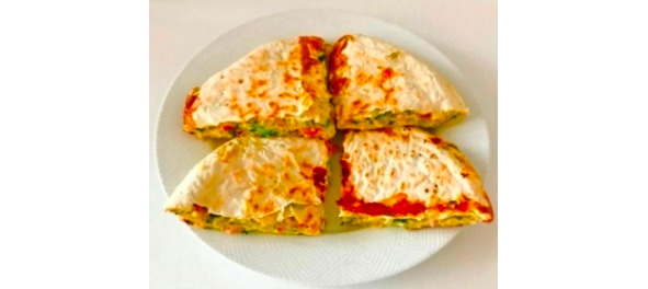 3. На сухую сковороду кладём круг из лаваша, заливаем яичной смесью, сверху кладём еще один круг из лаваша.