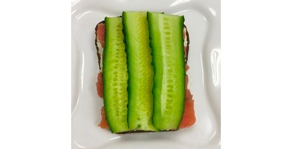 2. Хлеб намазываем творожным сыром, сверху кладём лосось и огурец.
