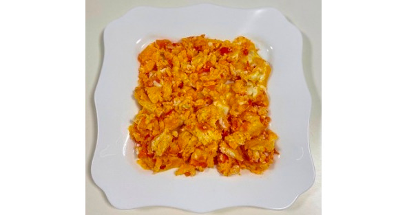 4. Перемешиваем яйца и помидоры, солим по вкусу и готовим на слабой мощности, периодически помешивая, до готовности.