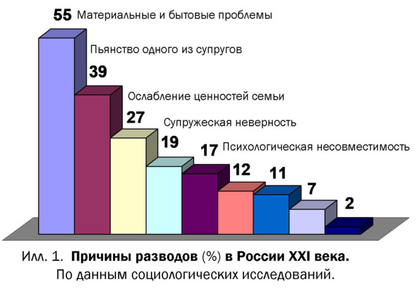Какую монографию по демографии ни возьмёшь, какой вузовский учебник по семейной психологии ни откроешь, хоть за шестидесятые годы прошлого века, хоть за восьмидесятые того же века, хоть самые последние, – везде встретишь стандартный перечень причин почему разводились советские люди и почему разводятся жители постсоветской России.Приведём результаты социологического исследования разводящихся пар, которое проводилось уже в XXI веке.Респонденты назвали следующие причины:– Материальные и бытовые проблемы – 55%.– Пьянство одного из супругов – 39%.– Ослабление ценности семьи для нынешнего поколения – 27%.– Супружеская неверность – 19%.– Психологическая несовместимость – 17%.– Однообразие и скука семейной жизни – 12%.– Новая любовь – 11%.– Отсутствие детей – 7%.– Другое – 2%.Графически данные выглядят так:Сложив все проценты, мы получим 189…