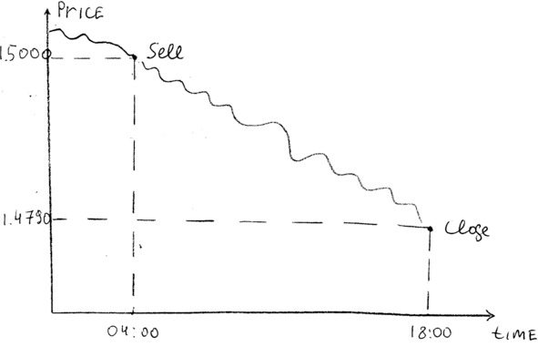 Мы считаем, что в Еврозоне, в принципе, все плохо. Вот-вот начнется гражданская война. Мы здесь отдаем приказ «SELL» – продать базовую валюту. То есть этим приказом мы продаем 100 000 евро, а на руках у нас 150 000 долларов. Большая пачка по высоте: около 30 см. Сейчас станет ясно, откуда деньги берутся. Дальше цена благополучно падает вниз. Смотрим котировку в те же 18:00 – котировка на уровне 1.4790. То есть в данный момент времени за 100 000 евро дают 147 900 долларов. Тут же в шесть часов вечера выходит на сцену Николя Саркози и заявляет: «Ребята, мы поймали всех зачинщиков беспорядка. Всех посадили в тюрьму. Кого-то выгнали. И вообще, это все противные журналюги лишнего наболтали: там всего-то пара арабов напились, несколько витрин разбили и все. Никакой гражданской войны не будет. Приезжайте к нам отдыхать.» И т. д. Все замечательно. Никакой войны не будет. Все хорошо, все под контролем. Все здорово. Завтра обычный рабочий день.