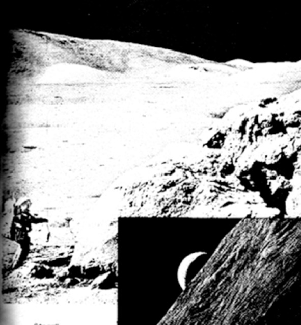 Возле обода конуса кратера, астронавты «Аполлон 14» обнаружили большие куски скалы размерами один метр (3 фута) в диаметре. (Подпись НАСА). Это одна из многих фотографии NASA, которые содержат признаки фальсификации. Верхняя часть отличается от нижней. Опять же, на фотографиях нет звезд! Если вы видели поразительно красивую модель Луны в парке развлечений «GoldenGate Park» в Сан-Франциско, вы поймете, как легко было создать модель Земли в лунном шоу.