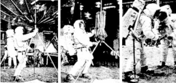 Обратите внимание на поразительное сходство между фоном на этом изображении и фотографиями НАСА, полученными, якобы, с Луны. Обратите внимание, что эти кадры тренировок космонавтов, которые проходили на киноплощадку, имитирующую лунную поверхность. Такую площадку можно было легко превратить в американскую «Луну» путем установки надлежащей декораций. Там можно делать «реальные лунные снимки», которые потом представляются как доказательства лунных прогулок. Процесс комбинированных съемок с использованием моделей был не сложным, так как никто не мог видеть, что происходит в капсуле, в «космосе» США до тех пор, пока «космонавты» не приземлились на Землю в капсуле на парашюте. Такие съемки уже делались в фантастических, художественных фильмах Стенли Кубрика. Полученные кадры были очень реалистичными.