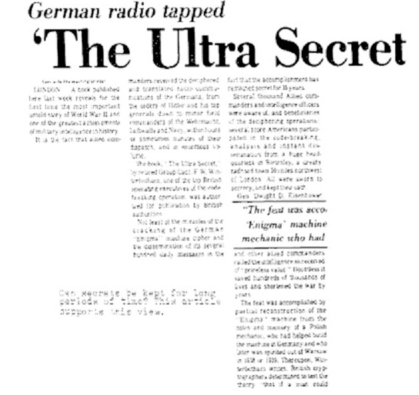 Эта статья поддерживает мнение, что достижение британской разведки, оставалась тайной 35 лет. При этом несколько тысяч союзных командиров и офицеров разведки были в курсе операции расшифровки. Несколько десятков американцев приняли участие в расшифровке, анализе и распространении сообщений, полученных при этих действиях, из огромной штаб-квартиры в Блетчли. Это был тоскливый, железнодорожный городок в 50 милях к северо-западу от Лондона. Все участники операции были приведены к присяге и поклялись хранить тайну, и все они сдержали клятву. Генерал Дуайт Эйзенхауэр: «Подвиг был совершен с использованием машины „Энигма“, с помощью механика, который ее знал, и других командиров союзников, сотрудников разведки. Мы получили „бесценные сведения“. Несомненно, это спасло сотни тысяч жизней и сократило войну на годы». Подвиг был совершен путем частичной реконструкции шифровальной машины «Энигма», с использованием знаний польского механика, который помог построить машину в Германии, и который позже был вывезен из Варшавы в 1938 или 1939. В связи с этим газета «Винтерботхем» пишет, что британские шифровальщики полностью подтвердили и проверили теорию о том, что человек может длительное время хранить секретные сведения.