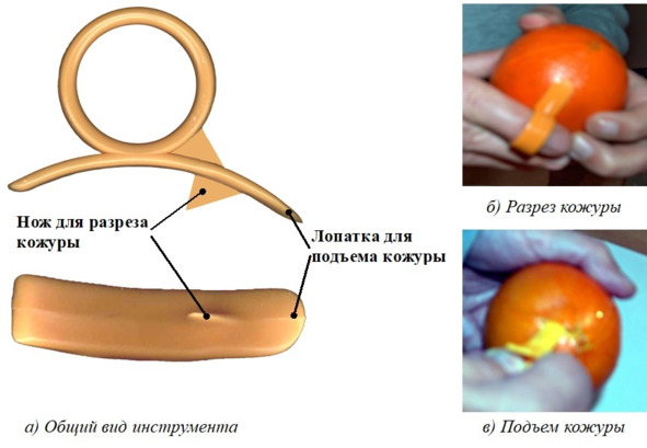 Он представляет собой только одну деталь, отлитую из пластмассы (рис. 22.32). Инструмент одевается на палец. Полукруглая форма инструмента позволяет легко скользить по поверхности апельсина, а размер и форма ножа легко надрезает кожуру и не портит сердцевину. На конце сделана лопатка, помогающая приподнимать кожицу. Это очень простой, удобный и малогабаритный инструмент. Такого типа инструменты появлялись и в прошлом, например, различные приспособления для открывания консервов и бутылок. Они будут изобретаться и в будущем.