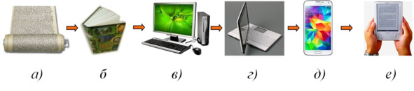Далее книги стали переводить в электронный вид и читали с экрана компьютера (рис. 22.34в). Такие книги не использовали бумагу, занимали мало места и не пылились, в одном компьютере можно иметь большую библиотеку, но появились неудобства, связанные с процессом чтения, – не везде удобно читать с компьютера, например, в кровати. В дальнейшем появились лэптопы (рис. 22.34г), мини-компьютеры, планшеты и смартфоны (рис. 22.34д). Их легко переносить и читать удобно в любом месте. Смартфоны и планшеты сегодня получили наибольшее распространение.