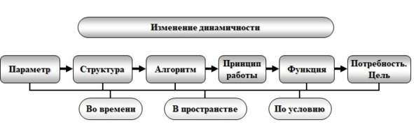 Степень динамичности увеличивается переходом от изменения динамичности параметров к изменению динамичности структуры, алгоритма, принципа действия, функции, потребности и цели.