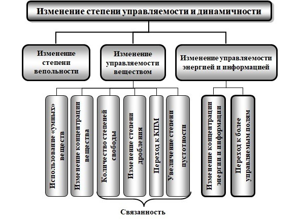 Смысл этой закономерности заключается в том, что невепольные системы стремятся стать вепольными, а в вепольных системах развитие идет в направлении перехода от механических полей к электромагнитным; увеличения степени дисперсности веществ, числа связей между элементами и отзывчивости системы»11.