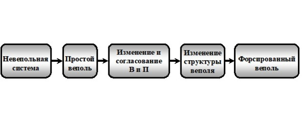 Общая тенденция развития веполей (рис. 23.2) представляет собой переходы: от невепольной системы к простому веполю; на следующем этапе происходит изменение и последующее согласование веществ и полей; затем изменение структуры веполя; и, в конце концов, переход к форсированному веполю.