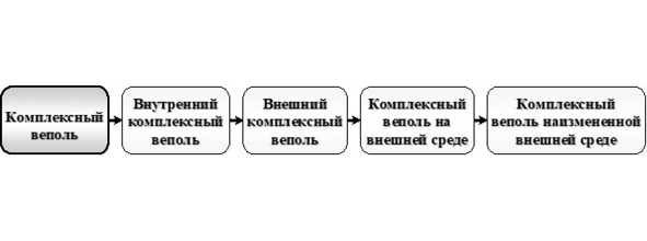 В свою очередь тенденция развития комплексного веполя (рис. 23.4) представляет собой переход от внутреннего комплексного веполя к внешнему комплексному веполю и к комплексному веполю на внешней среде.