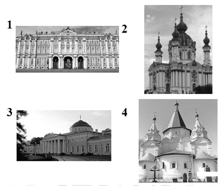16. Какой из представленных памятников архитектуры был создан в период правления матери монарха, изображенного на марке? В ответе запишите цифру, которой обозначен этот памятник архитектуры. Укажите название данного памятника архитектуры.