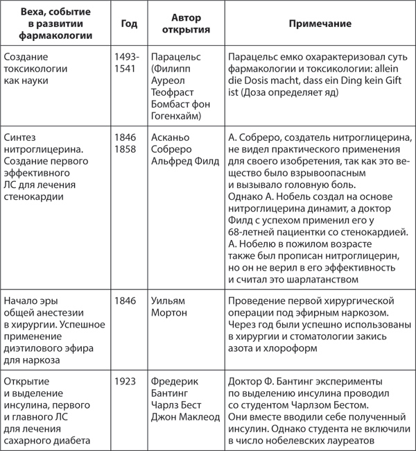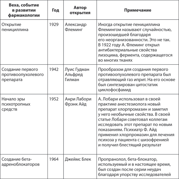 Время возникновения фармакологии как науки во многом зависит от точки зрения самого читателя. ЛС, созданные на основе растений, тканей животных, минералов, описаны в древнем Египте, Китае, Центральной Азии в 2000-х годах до нашей эры. Хорошо известен вклад в развитие лекарственной терапии Гиппократа, Цельса, Авиценны. Тем не менее существует мнение, что фармакология – наука очень молодая, существующая менее 150 лет, и она появилась благодаря возможности выделять чистые соединения и использовать научные методы исследований. Ниже приведены некоторые важнейшие вехи в развитии фармакологии и имена великих ученых, совершивших эти открытия.