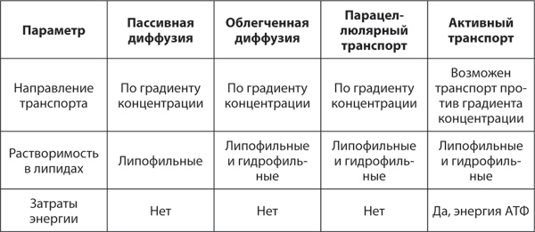 1. Пассивная (простая) диффузия (трансцеллюлярный транспорт). При этом виде всасывания ЛС движется по градиенту из области высокой концентрации лекарства (просвет кишечника, место инъекции) в область с низкой концентрацией (плазма крови). Для того чтобы абсорбироваться, ЛС должно пройти липидные мембраны клетки, растворившись в них. Это возможно только для небольших липофильных, но не гидрофильных веществ (рис. 1). Пассивная диффузия не требует затрат энергии. Этот механизм абсорбции характерен для кишечника, сосудов головного мозга.