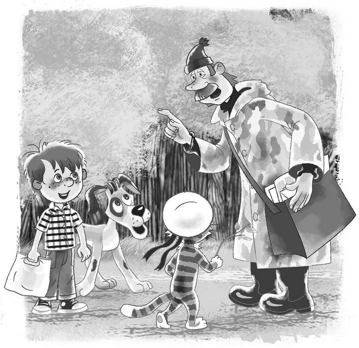 А тут дядя Фёдор идёт из магазина с покупками. Коту он матроску купил, а Шарику – ошейник с медалями.