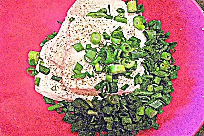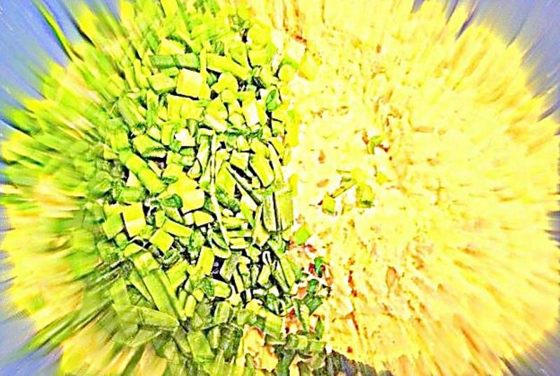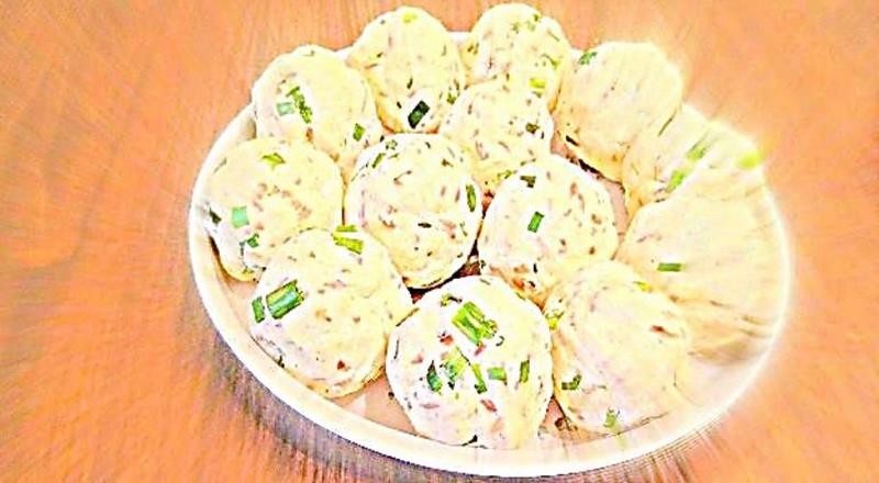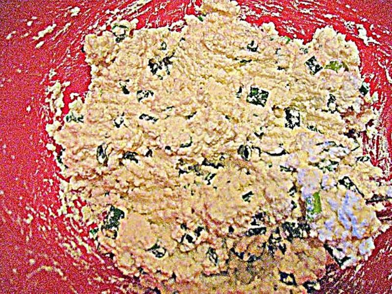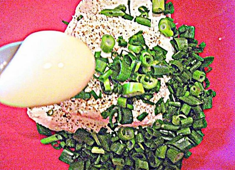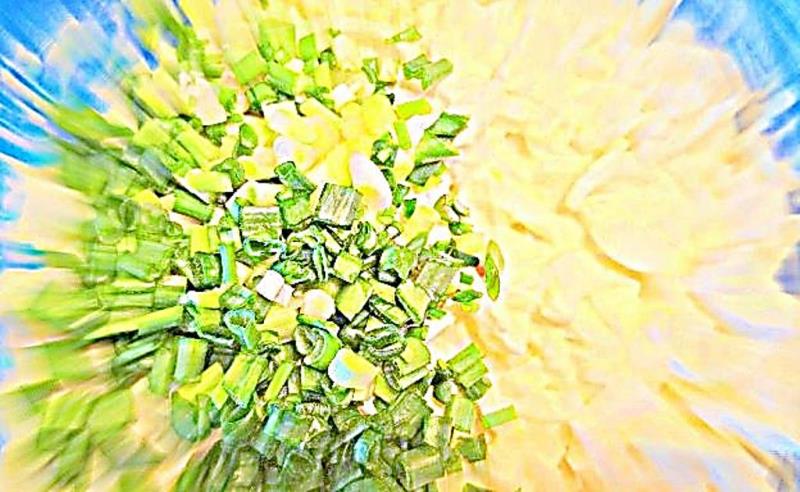 В одной посуде смешать творог, манную крупу, сырые яйца, смесь из масла, желтков и семечек, добавить рубленного зелёного лука, посолить, поперчить и перемешать.