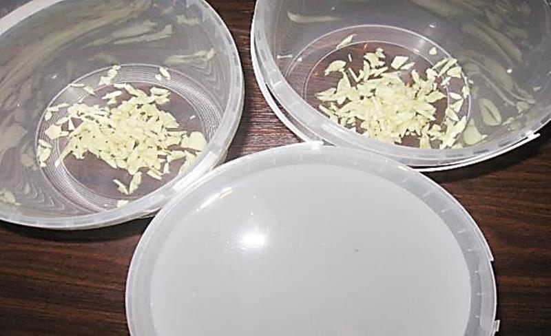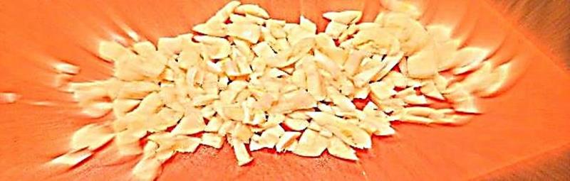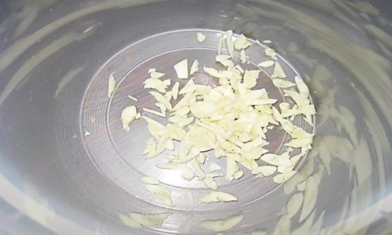 Крошите чеснок на дно банки, в которой будете солить огурцы.