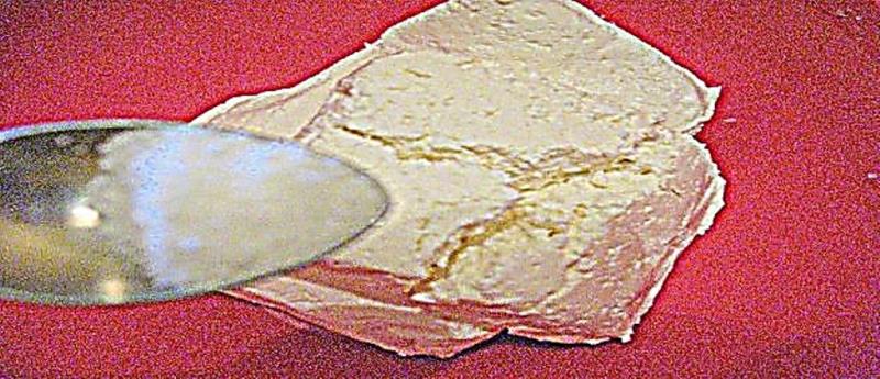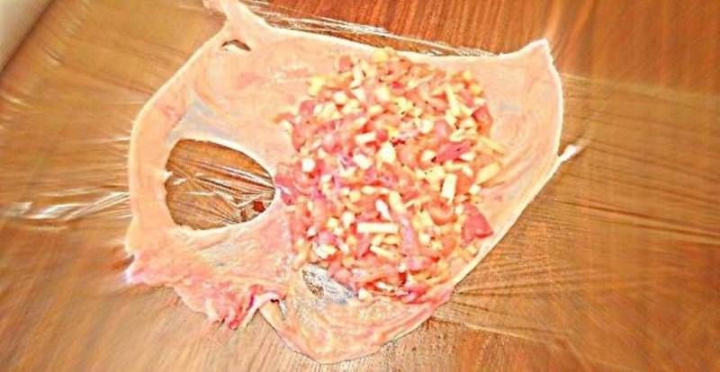 Расстелить пищевую плёнку на столе и на неё расстелить куриную кожу.