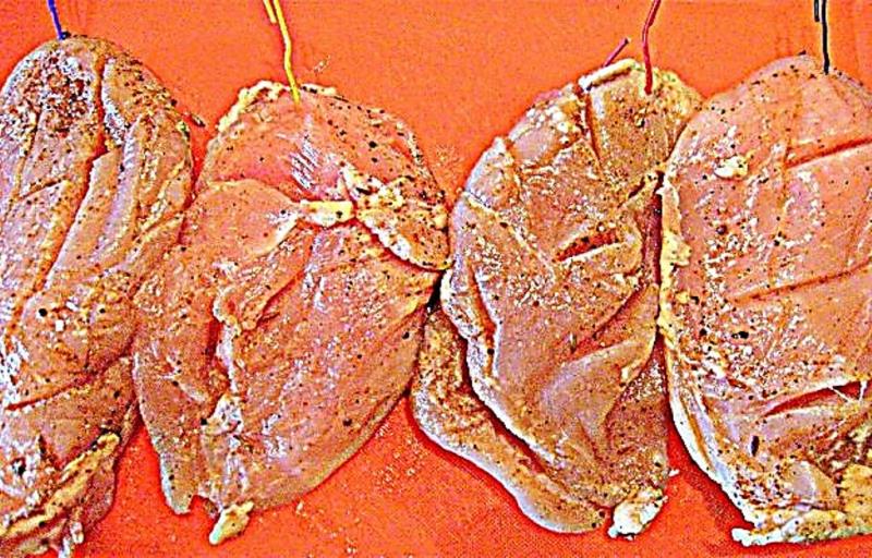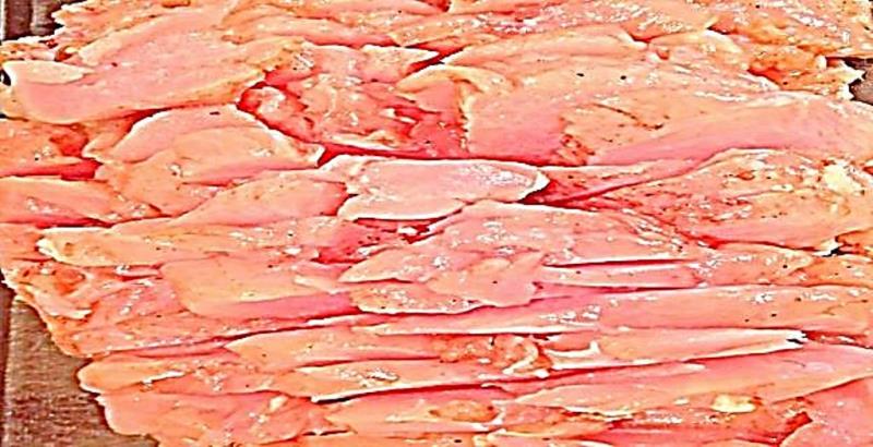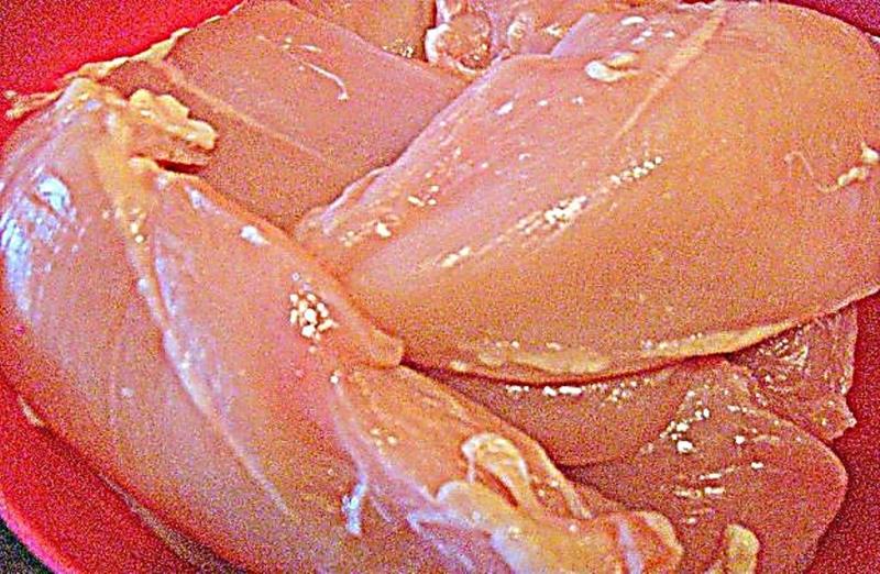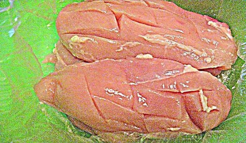 Сделайте надрезы по поверхности грудки, прорезав обволакивающую плёнку и сложите грудки в пакет.