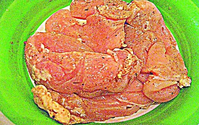 Выньте мясо из холодильника, переложите в дуршлаг, чтобы стекли остатки маринада.