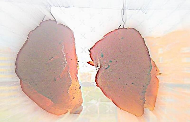 Затем, сделав крючки из скрепок в пластике и подцепив на них полосы печени, развесить их на воздухе (в тени) сушиться. Если есть угроза прилёта насекомых, то навесить вокруг печени марлю.