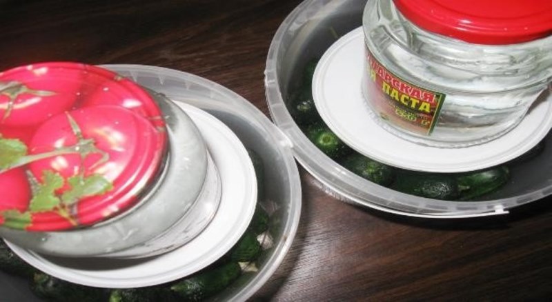 Ставим сверху, на огурцы, блюдце или крышку, далее – сверху груз, например, банку с водой и заливаем рассол.
