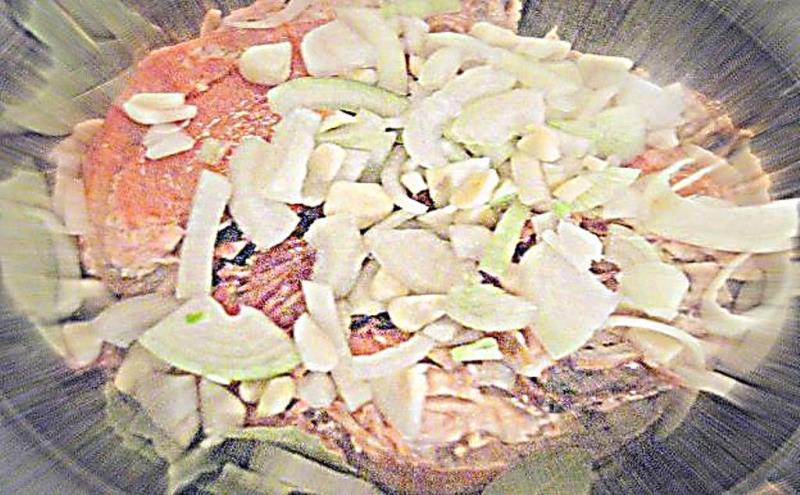 Обжарить рубленный репчатый лук в растительном масле, затем минут пять потушить его в томатной пасте.