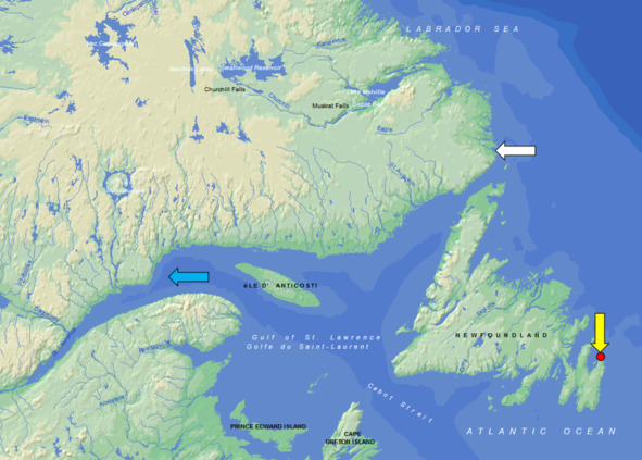 Залив Сент-Льюис (белая стрелка), Сент-Джонс (желтая стрелка), устье реки Святого Лаврентия (голубая стрелка)