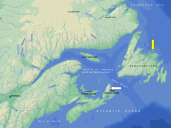 Кейп-Бретон (белая стрелка), остров Фанк (желтая стрелка)
