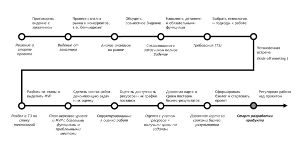 Проект, в зависимости от того, что надо получить и как, конечно же, стартует по-разному. Ниже нарисована примерная схема старта, где сверху на этапах указаны действия, а снизу под линией – результат этого этапа.