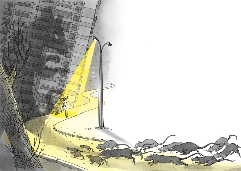 Глядеть на этот праздник можно долго, но старик переходит к другой трубе и видит высокий грязно-белый дом. Он тянется бесконечной стеной и глядит ровными рядами окон, которых в нём, наверно, сотни. Старику это здание неинтересно. Он смотрит на серую дорожку, идущую вдоль дома, и видит на ней девочку-подростка. Она бредёт, горбясь под тяжестью потрёпанного рюкзака, и вид у неё невесёлый.