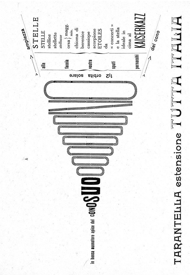 Осмыслению этого опыта был посвящен манифест Маринетти «Динамическая и синоптическая декламация», в одном из пунктов которого оговаривалась возможность хорового чтения53. Миланское издание «Пьедигротты» вышло два года спустя после вышеописанного исполнения в галерее54. Своим видом книга отсылала к parole in libertà Маринетти. В ней активно использовались приемы экспериментальной типографики футуристов. И ее же можно рассматривать как своего рода партитуру, отсылающую к состоявшемуся выступлению55. Книга интересна совмещением: во-первых, стихограмм (например, на странице h (ил. 1), где слова «конус» и «звук», сono и suono, принимают форму конуса), которые выглядят как подверстанные иллюстрации. Во-вторых, графики: наборный орнамент в виде волнистых линий, как на странице i (ил. 2), должен был обозначать колыхание толпы, вышедшей отмечать праздник на улицы. В-третьих, собственно, партитуры. Для передачи интонации чтения и его ритма (например, на стр. m, илл. 3) Канджулло заимствовал различные обозначения из нотного письма: такты, ферматы, темповые указания (prestissimo, то есть самый быстрый темп) и т. п.