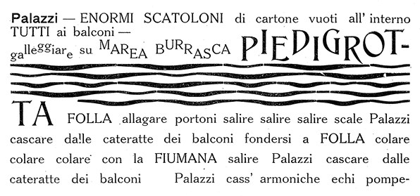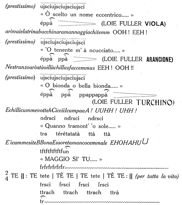 К непосредственной фиксации в письменных текстах интонаций звучащей речи сам Маринетти не обращался. Однако такие попытки предпринимал в своих книгах другой футурист, в прошлом артист варьете Франческо Канджулло. «Пьедигротта» Канджулло еще до того, как быть напечатанной, была представлена на одном из собраний футуристов в римской галерее Спровьери в марте 1914 года. В этом поэтическом перформансе участвовали Маринетти, Канджулло, Джакомо Балла и некоторые другие футуристы. Текст «Пьедигротты» был посвящен одноименному буйному неаполитанскому празднику (Канджулло был родом из Неаполя) и исполнялся в том числе с помощью хоровой декламации. Он сопровождался шумовой музыкой, осыпанием зрителей конфетти, взрывами и дымом петард. Для создания праздничной атмосферы, вспоминал участвовавший в этом действе галерист Джузеппе Сповьери, по залу даже собирались разносить пиццу в жаровнях52.