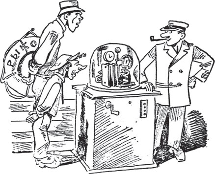 Иллюстрация Б. Антоновского к рассказу «Путешествие Ежа». Ёж. 1929. № 10. Среди персонажей иллюстрации узнается шаржированный образ Д. Хармса.
