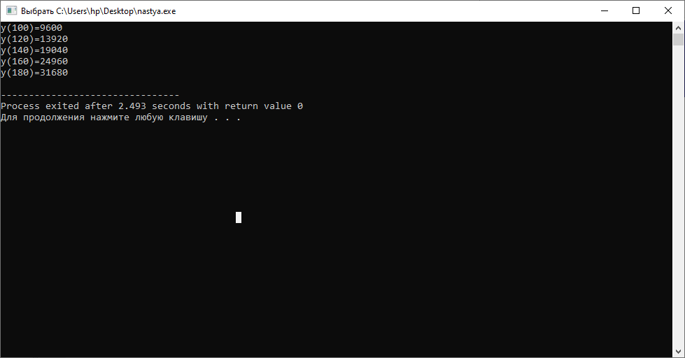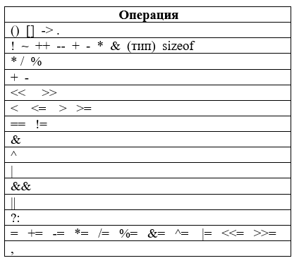 for (int i=0; i { …. } int i=0 – инициализация, i i++ – модификация. Каждый раз выполняется тело цикла, в конце идет модификация (в данном случае i++), поэтому цикл будет выполняться столько раз, сколько указано в условиях, если условие верно, то выполняется тело еще раз. Задание: вычислить значение функции y=x*x-4*x при х от 100 до 200 включительно, начиная от 100 с шагом 20. Решение задачи в Листинге 7, результат решения Листинга 7 на Рисунке 1. Листинг 7 #include using namespace std; int main() { int y; for(int x=100;x<=200;x=x+20) { y=x*x-4*x; cout<<"y("< } } Рисунок 1 Типы данных Типы данных: char хранит символ (один байт), int – целочисленные значения, float – вещественные значения с одинарной точностью, double – вещественное значения с двойной точностью и т.д. Модификаторы: short – короткое целое, long – длинное целое. Диапазон значений зависит от аппаратной и системной платформы. Например, int будет или 16, или 32. Узнать это возможно, используя операцию sizeof(), она возвращает размер в байтах, смотри Листинг 8, Рисунок 2. Листинг 8 #include using namespace std; int main() { cout< } Рисунок 2 Время жизни и область видимости переменной Программный блок – это часть программы между фигурными скобками. Локальные переменные живут только во время программного блока. Локальные переменные объявлены внутри блока. Глобальная переменная живет на протяжении всей жизни программы. Глобальная переменная объявляется вне блоков программы. Пример в Листинге 9. Если убрать скобки в строках 8 и 9, компилятор выдаст ошибку. Листинг 9 1#include 2using namespace std; 3 4 int main() 5 { 6 int i=10; 7 cout< 8 { 9 int i=11; 10 cout< 11 } 12} Преобразование типов В зависимости от версии компилятора, округление будет либо в большую, либо в меньшую сторону. Смотри Листинг 10, Рисунок 3. Листинг 10 #include using namespace std; int main() { int y; y=(int)(3/10); cout< y=(int)(10/3); cout< } Рисунок 3 Поразрядные операции Напишите программу, которая переводит введенное положительное число в двоичное систему счисления и выводит на экран результат перевода. Пример решения задания в Листинге 11. Листинг 11 #include using namespace std; void dv(int a) { int b[100]; int i=0; while(a>1) { b[i]=a%2; a=(a-a%2)/2; i++; } b[i]=a; for(int j=i;j>=0;j–) cout< } int main() { int a; cin>>a; dv(a); return 0; } Ниже даны тесты для проверки задач программы. Тест 1 a=10 Результат 1010 Тест 2 a=2 Результат 10 Тест 3 a=8 Результат 1000 Поразрядные операции применимы только к целочисленным аргументам (char, short, int и long). & – поразрядное И | – поразрядное включающее ИЛИ ^ – поразрядное исключающее ИЛИ << – сдвиг влево >> – сдвиг вправо ~ – одноместное поразрядное дополнение до единицы В побитовых операциях работа идет над каждым битом. Поразрядное включающее ИЛИ Пример: 8 | 10 = 10 8 – это 1000 в двоичной системе счисления, 10 – это 1010 в двоичной системе счисления. С каждым битом числа выполняется операции логическое ИЛИ, и вместо этого бита ставится результат этой операции, смотри Рисунок 4. Рисунок 4 Поразрядное И Пример: 8 & 10 = 8 8 – это 1000 в двоичной системе счисления, 10 – это 1010 в двоичной системе счисления. С каждым битом числа выполняется операции логическое И, и вместо этого бита ставится результат этой операции. Пример программы в Листинге 12. Листинг 12 #include using namespace std; void dv(int a) { int b[100]; int i=0; while(a>1) { b[i]=a%2; a=(a-a%2)/2; i++; } b[i]=a; for(int j=i;j>=0;j–) cout< } int main() { int a,b; int c; cin>>a>>b; c=a|b; cout< dv(a); cout<<" | "; dv(b); cout<<" = "; dv(c); c=a&b; cout< dv(a); cout<<" & "; dv(b); cout<<" = "; dv(c); return 0; } Ниже даны тесты для проверки задач программы. Тест 1 a=10 b=8 Результат 1010 | 1000 =1010 1010 & 1000 =1000 Тест 2 a=11 b=3 Результат 1011 | 11 = 1011 1011 & 11 = 11 Сдвиг влево Пример: 10 << 2 = 1000 Двоичная запись числа