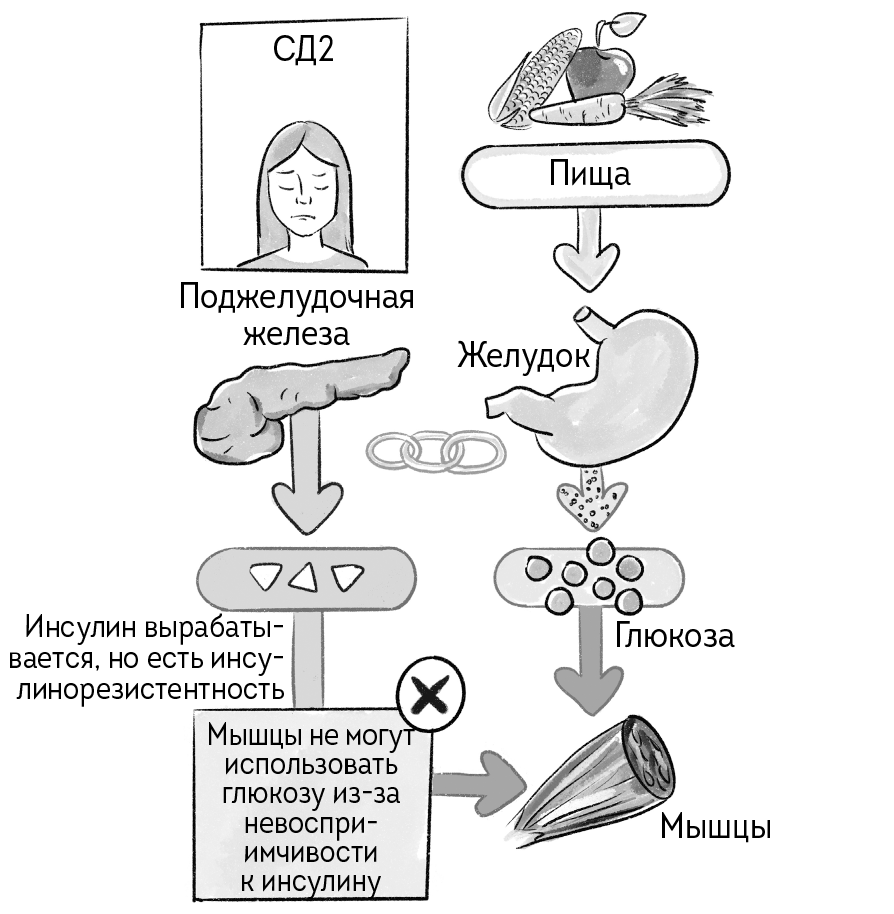 У больного, страдающего САХАРНЫМ ДИАБЕТОМ 2 ТИПА (СД2), поджелудочная функционирует нормально и вырабатывает инсулин, однако организм не реагирует на гормон должным образом. Ключевым механизмом развития заболевания является ИНСУЛИНОРЕЗИСТЕНТНОСТЬ – невосприимчивость клеток к действию гормона, снижение их биологического ответа при его нормальной концентрации в крови. В этом случае мышечная и жировая ткани не могут поглощать глюкозу, а в печени нарушается процесс синтеза гликогена.