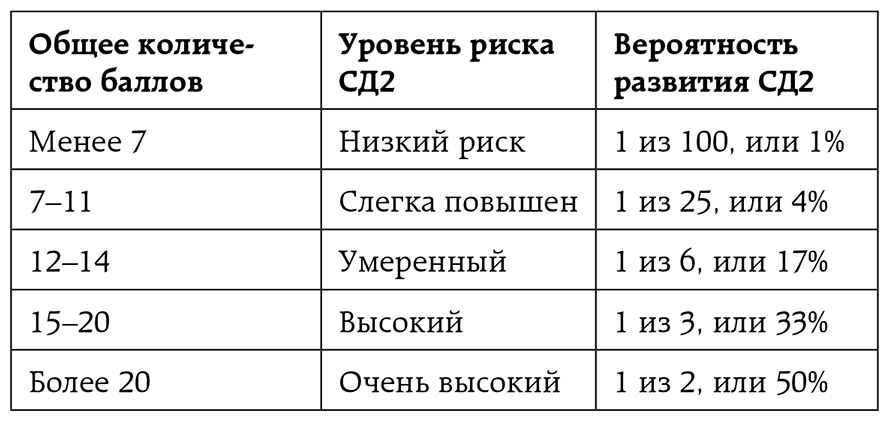Шкала FINDRISC (The Finnish Diabetes Risk Score) – анкета для оценки риска развития СД, разработанная Финской ассоциацией диабета. Она состоит из 8 вопросов. На каждый нужно выбрать один вариант ответа. В конце теста необходимо суммировать набранные баллы и найти свой результат в таблице.