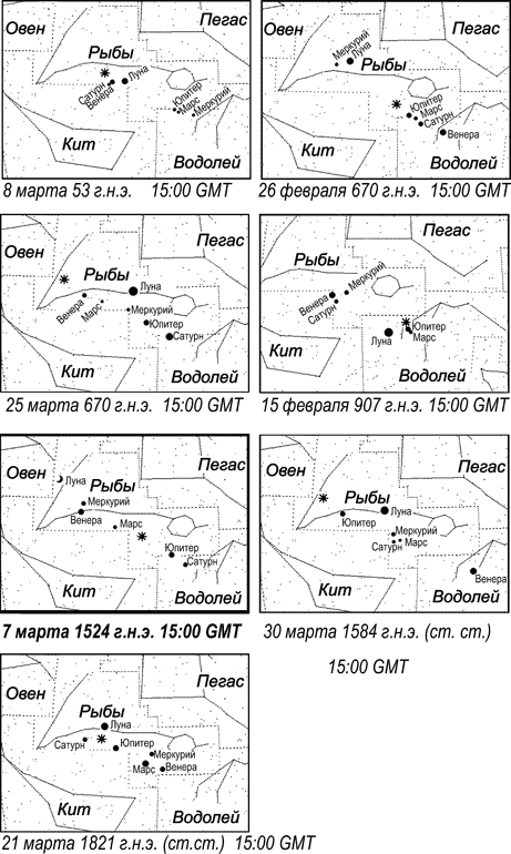 Рис. 1.5. Карты неба для всех шести случаев в промежутке времени от начала нашей эры до 1900 г., когда все семь планет древности собрались в Рыбах. Это случилось в 53, 670 (два раза), 907, 1524, 1584 и 1821 гг. Приблизительный, но достаточно точный для наших целей расчет по программе Turbo-Sky