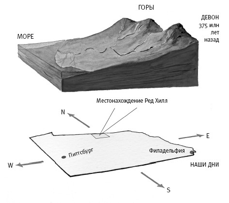По обочинам дорог в Пенсильвании мы искали то, что осталось от древней дельты реки, во многом похожей на сегодняшнюю Амазонку. Штат Пенсильвания (внизу) и схема его топографии в девоне (вверху).