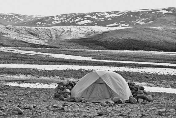 Наш лагерь (вверху) кажется крошечным на фоне окружающего ландшафта. Мой летний дом (внизу) – небольшая палатка, обычно обложенная камнями, чтобы защитить ее от ветров, которые могут дуть здесь со скоростью больше двадцати метров в секунду. Фото автора.