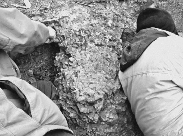 Процесс поиска ископаемых начинается с постепенного извлечения фрагментов породы. На этих фотографиях показаны этапы извлечения ископаемых остатков и их транспортировки с поля в лабораторию, где образец тщательно очищается от лишней породы, и перед нами предстает скелет животного, ранее не известного науке. Слева вверху – фото автора, остальные любезно предоставил Тед Дешлер (Академия естественных наук Филадельфии).
