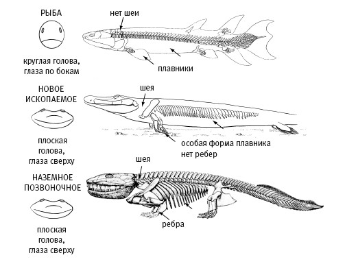 Ископаемое, которое постепенно открывалось нашим взорам осенью 2004 года, представляло собой прекрасную промежуточную форму между рыбами и наземными позвоночными. Между этими группами животных есть немалая разница. Голова у рыб коническая, в то время как у древнейших наземных позвоночных головы были плоские, с глазами наверху, как у крокодилов. У рыб нет шеи, их лопатки прикреплены к черепу рядом костных пластинок. У древнейших наземных позвоночных, как и у всех их потомков, шея имеется, то есть голова может двигаться независимо от лопаток и плечевого пояса конечностей.