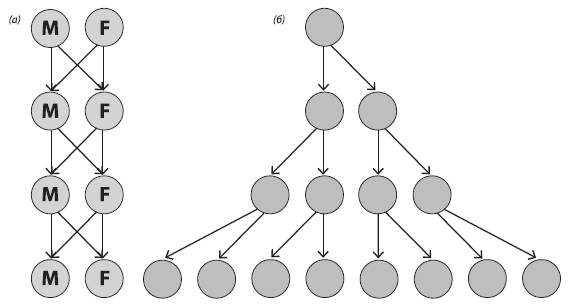 Схема, иллюстрирующая «двойную цену самцов». У раздельнополых организмов половину потомства каждой самки составляют самцы, которые сами никакого потомства произвести не могут. При бесполом размножении все потомство состоит из самок (при самооплодотворении – из самостоятельно размножающихся гермафродитов). Поэтому при прочих равных размножение без участия самцов вдвое эффективнее, чем с самцами. На рисунке показана ситуация, когда каждая самка производит ровно двух потомков.