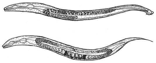 У круглых червей Caenorhabditis elegans нет самок, а есть только самцы (вверху) и гермафродиты (внизу). Гермафродитов можно отличить по тоненькому длинному хвостику.