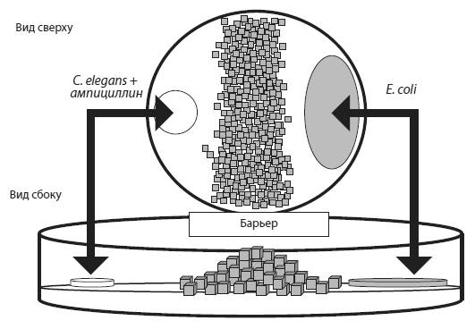 В первой серии проверялась гипотеза о том, что перекрестное оплодотворение помогает избавляться от вредных мутаций. Эксперимент продолжался 50 поколений (червей, разумеется, а не экспериментаторов). Каждое поколение червей подвергалось действию химического мутагена – этилметансульфоната. Это увеличило частоту мутирования в четыре раза. Молодых животных помещали в чашку Петри, разделенную пополам барьером из крохотных кирпичиков (см. рисунок), причем червей сажали в одну половину чашки, а их пища (бактерии E. coli) находилась в другой половине. Таким образом, чтобы добраться до еды, а значит получить шанс выжить и оставить потомство, черви должны были преодолеть барьер. Тем самым экспериментаторы повысили эффективность очищающего отбора, который отсеивает вредные мутации. В обычных лабораторных условиях эффективность отбора низка, потому что черви окружены пищей со всех сторон. Это позволяет выжить даже очень слабым животным, перегруженным вредными мутациями. В новой экспериментальной установке этой уравниловке был положен конец. Чтобы преодолеть стенку, червь должен быть здоров и крепок.